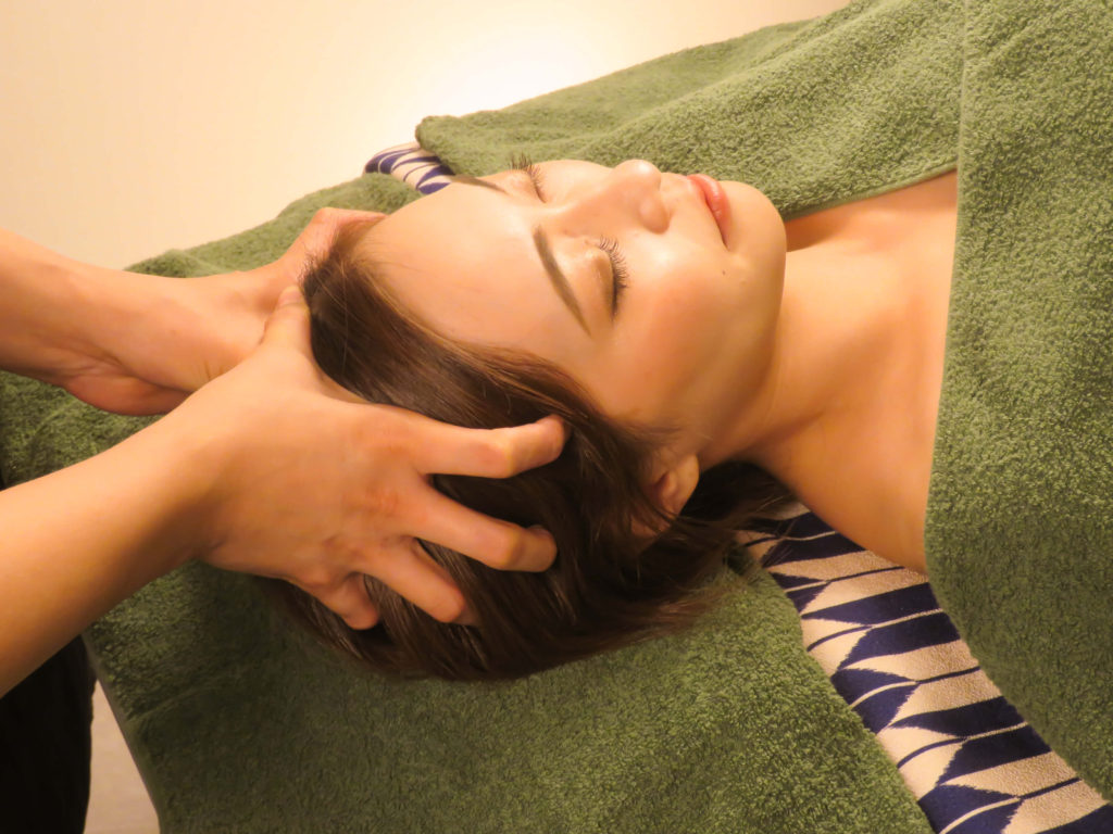 コース内容(デコルテ周りをオイルでマッサージ+ドライヘッドマッサージ&フェイスマッサージ+頭からお顔にかけて持続圧をかけながらの小顔頭蓋骨矯正)